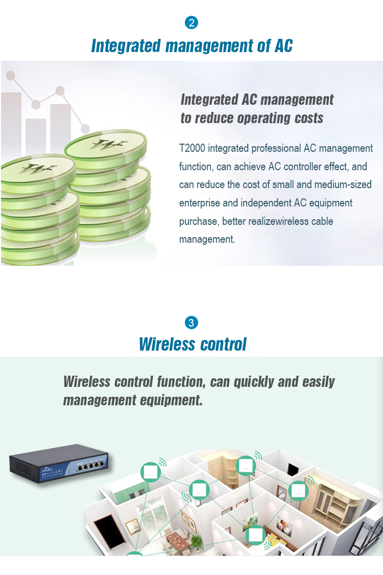 T2000 is a WLAN controller for wireless AP produced by Shenzhen Shuotian, it can manage, control, and monitor 50PCS AP in the same networking diagram simultaneously. It makes the small area wifi solution in the hotel, school, industrial, supermarket, restaurant easier in setting, control and monitor, human cost saved in much.